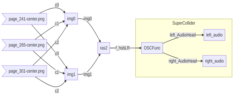 Image data of the animation runs through several filters to create the graphic effects. In the last filter the image data is analyzed at two positions. Per position there is a small square area that is sampled. A single point would be too affected by image noise and rounding errors. For each area, the averaged color, saturation and brightness are calculated. These values are then sent via Open Sound Control. If the animation runs with 25 frames per second, 25 OSC packages are per second are send.