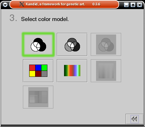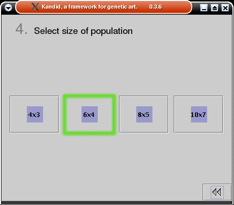 Up to now we have ignored the evolutionary aspect of Kandid. There is one, but with one important restriction. Inside of Kandid is no fitness function. Or in plain words, Kandid miss any algorithm that can decide which images are interesting, beautiful or never seen before. So you must do the job.