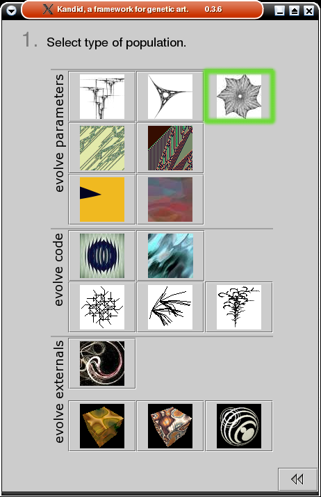 Now you can evolve the new image population. There are several buttons on the left side of the population window.